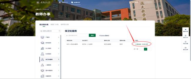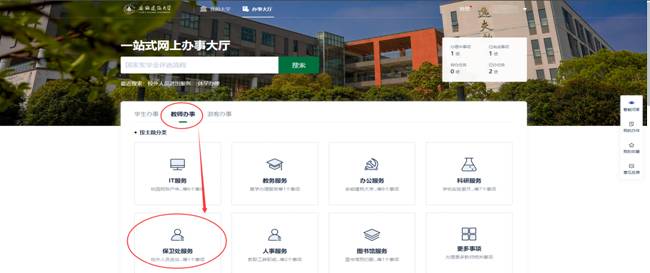 用户登录系统后,可在办事大厅页面中,通过主题分类或者部门分类,查询对应的服务事项。如依次点击“教师办事”—>“保卫处服务”,即可查看到该分类下的服务事项。