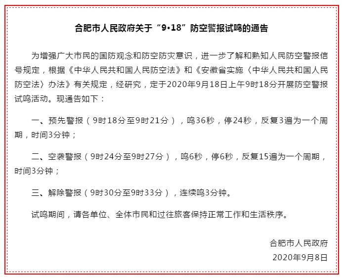 学校于2020年暑假在南校区图书馆顶层安装防空警报,根据《合肥市人民政府关于“9.18”防空警报试鸣的通告》,学校在2020年9月18日上午9时18分同步试鸣,全长共15分钟,现通知如下: