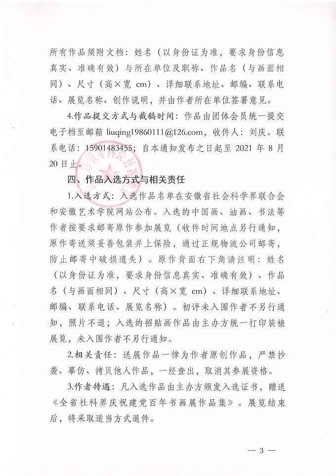 现将《关于征集全省社科界庆祝建党百年书画展作品的通知》(皖社科联通字〔2021〕12号)转发给您,请按照要求做好组织与作品报送,作品以学院(部门)为单位于8月1日前统一提交电子版至科技处任磊电子政务,逾期不再受理。联系人:任磊,联系电话:63828059。