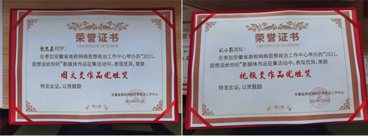 本网讯 近日,安徽省高校网络思想政治工作中心、安徽省易班发展中心公布了“2021,我想说给你听”新媒体作品征集活动比赛结果,在全省共13件获奖作品中,我校有3件作品获奖。其中,公共管理学院包思嘉同学的《致十八岁的自己》和电子与信息工程学院汪图南同学的《2021,我想说给自己听》获得“图文类作品优胜奖”,公共管理学院“公小影”团队创作的《我想说给你听》获得“视频类作品优胜奖”。