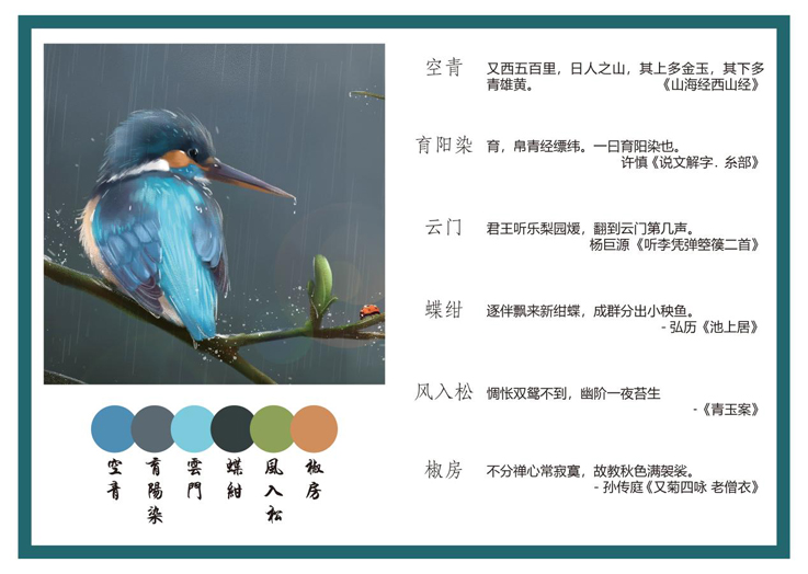 作品《入墨》选用了螺子黛、青緺、青雘、水绿、琬琰、老憎衣六种颜色。螺子黛出自于孙花翁的《送女冠还俗》“重调螺黛为眉浅”,为画面整体奠定了清新脱俗的基调。青緺来自于黄滔的《寄少常卢同年》,颜色偏暗色,展现了中国色的浓墨重彩之美。青雘出自于张衡的《南都赋》其中的“青雘丹栗”,水绿和琬琰分别出自于的《渔翁》和《楚辞·远游》,老僧衣则是出自于《又菊四咏 老僧衣》,通过巧妙的搭配,展现出春日一隅的韵味,令人心旷神怡。