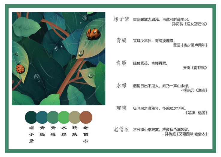 同学们创作热情高涨,运用“中国色”创作了一幅幅精美的作品。作品《春》采用芰荷、碧山、禹余粮、吉量、鞓红、琼琚六种生机勃勃的色彩搭配,展现出春日中鲜活灵动的一景。芰荷出自于《楚辞·离骚》,深绿的颜色体现出叶子的活力。碧山出自于李白的《山中问答》,翠绿色表现出叶子的稚嫩。禹余粮、吉量分别出自于纪昀的《乌鲁木齐杂诗选之神异》和张云的《浮山禹庙观山海经塑像》,而鞓红来于方岳的《卖花翁》,让七星瓢虫的颜色艳丽,形象活泼。最后一个颜色琼琚出自于《诗经·卫风木瓜》,六种风雅清新的“中国色”丰富了画面的构成层次感,同时也表达了古诗中的美妙意境。