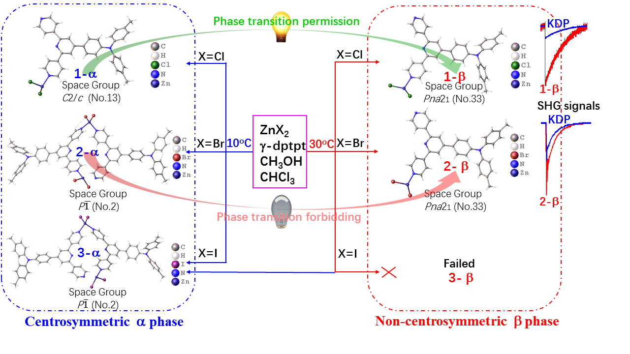 本网讯 近日,材化学院张俊教授团队选择D-A型有机配体γ-dpdpt,通过温度控制,高效调控卤素家族配位聚合物的中心-非中心结构对称性(见图1)。研究发现,体系在平衡条件下,对于Cl、Br基配位聚合物,高温能控制非中心对称β物相(1β, 2β),低温能控制非中心对称α物相(1α, 2α)。对于I基配位聚合物,高温低温下均得到中心对称α物相(3α)。中心对称1α在空气中能够自发相变为非中心对称1β, 2α, 2β, 3α在空气中均能稳定存在。1β, 2β不仅具有优良的发光性能,而且具有相位匹配二次谐波响应,分别约为商业KDP的4.5, 2.5倍。