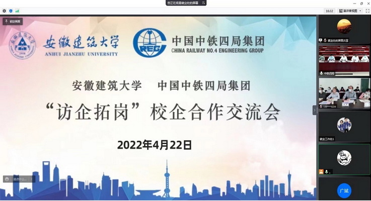 本网讯 为扎实开展高校书记校长访企拓岗促就业专项行动,进一步推进毕业生就业工作,4月22日下午,学校与中铁四局集团联合举行“访企拓岗”校企合作线上交流会。校党委常委、副校长闵杰,就业工作处、教务处、土木学院、环能学院、经管学院、机电学院、外国语学院等相关负责人参加会议。会议由就业工作处负责人主持。