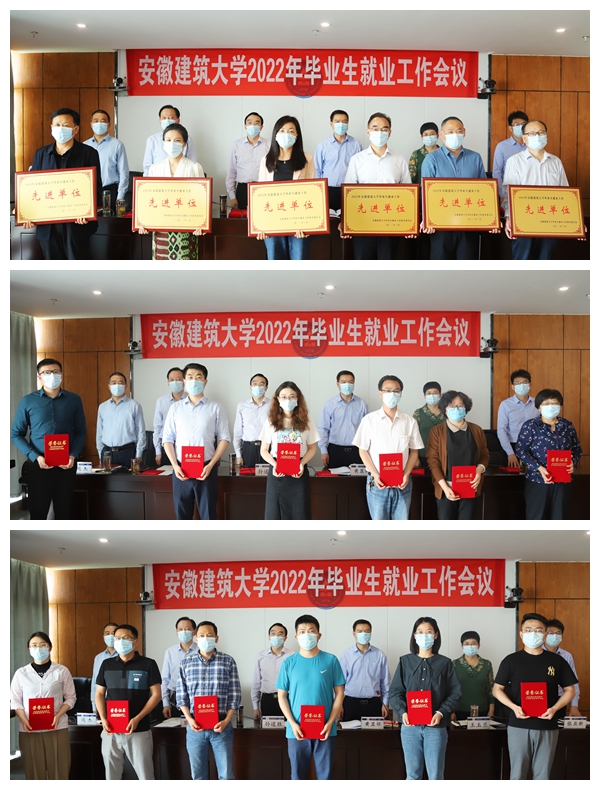 校党委常委、副校长蔡新立宣读《关于表彰2021年度就业工作先进单位和先进个人的决定》,与会校领导为就业工作先进单位、先进个人颁奖。环能学院党委副书记胡志龙、公管学院党委副书记马晓艳作工作交流发言。