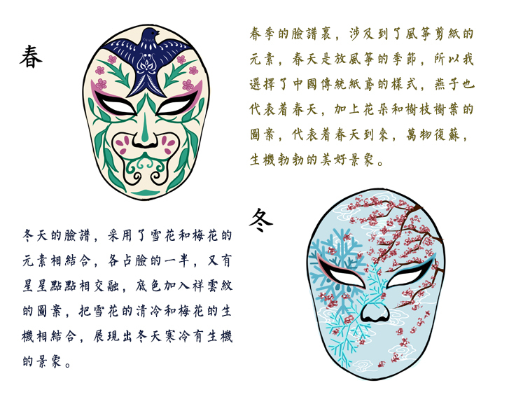 19级动画专业田祎凡则把传统脸谱与季节相结合,分别以春、冬两季节作为创作背景,春季脸谱以风筝剪纸作为主元素,与传统纸鸢的形象相得益彰,搭配以萌发的新芽,彰显着万物复苏、生机勃勃的美好景象。冬季脸谱则将雪花和梅花相结合,底色加入祥云纹图案,将雪花的清冷和梅花的生机相结合,展现出冬季中的大地万物在凛冽寒风中依旧生机顽强。