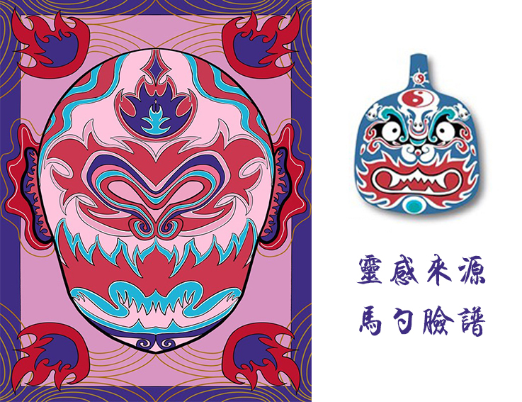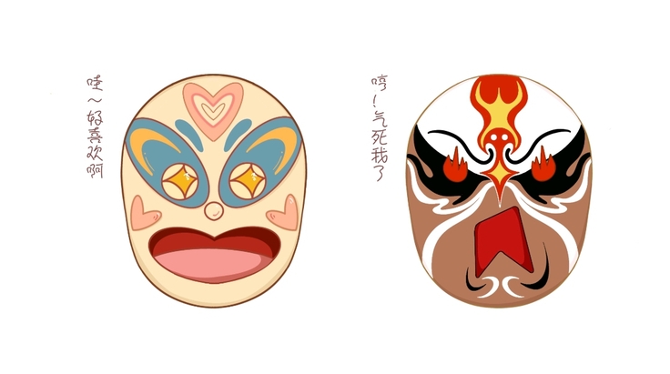 20级视觉传达专业郭思帆将现代“表情包”文化元素与传统脸谱相结合,用圆润的线条和柔和的颜色来表现 “喜欢”这一情绪,用尖锐的线条和亮眼的颜色来表现“生气”的情绪,栩栩如生,惟妙惟肖。