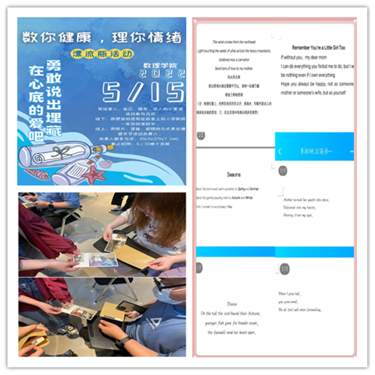 不管是文字或是语言,那些来自心灵的声音,都传递了人们的真情实感。“悦纳自我 从心开始 ”签名活动让人敞开心扉。土木学院举办了“爱润心田——做情绪的主人”主题交流分享会,外国语学院开展的“感恩母亲相伴,悦享美好时光”英文三行情诗主题活动,公管学院开展的“与心相约 语寄未来”春日书信寄未来活动,数理学院举办的“数你健康,理你情绪”漂流瓶活动,环能学院举办的“向阳而生 筑梦心铃”微关爱漂流瓶活动中,学生们小心翼翼地将自己的“悄悄话”写在信笺纸上,放入漂流瓶中,传递了一份愿望、一份祝福、亦或自己的困惑。这些活动不仅为同学们提供了尽情表达内心情感的机会和渠道,也增强了同学们之间的沟通、交流与互动,帮助学生树立心理保健意识,调动学生自我发展的积极性和主动性,提高学生的社会适应能力、心理自助能力和自我调适能力。