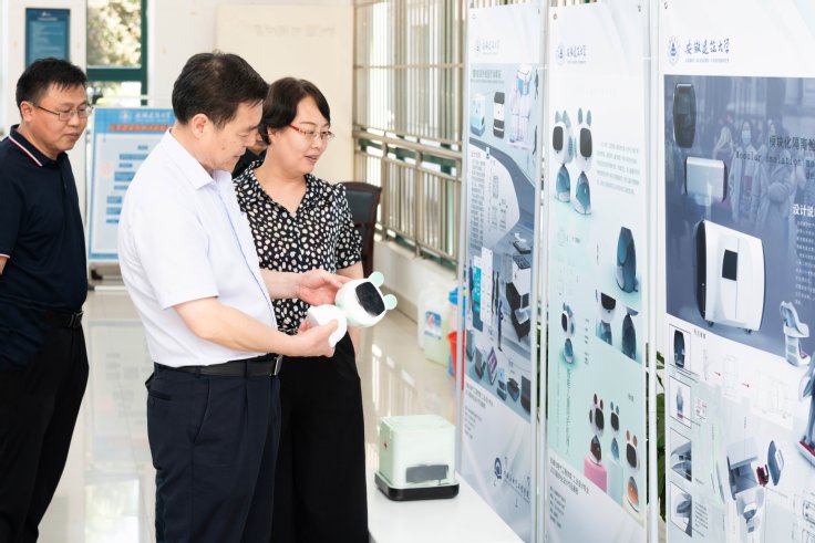 黄显怀一行在机电楼展厅参观了机电学院2022届工业设计专业举办的毕业设计展,并与在场的学生交流了作品设计、制作的原理。