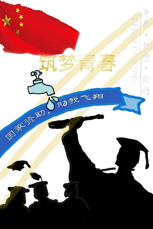 感恩在国家的政策帮助下,学子们可以放飞青春,顺利度过大学生活,画中,国家犹如水龙头般,一点一滴,帮助学子毕业,得已筑梦青春。