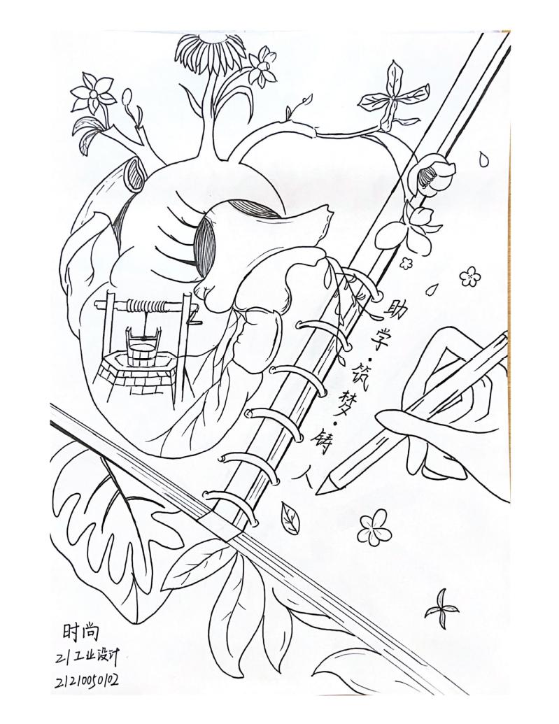 书本是学生身份的象征,以书本为底,跃然纸上的心脏中有一处水井,饮水思源,对现在美好生活的思考,并把资助的感恩放在心里,且在心中生根发芽开出了花。书本外茂盛的树叶是学生源源不断的活力以及周围美好事物的象征。