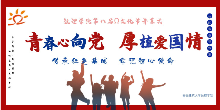 编者按:Ω,即Omega,中文音译为欧米伽,在数理化中都代表不同含义,充分体现数理特色,蕴含数理魅力。“Ω”文化节作为数理学院传统特色活动,活动周期持续一学年,学院从启动“Ω”文化节系列活动,已走过了八个春秋。八年的不断探索,八年的不断创新,见证了数理学子一直以来积极向上的青春风貌。今年的文化节因为中国共产党建党100周年显得意义非凡,以“爱国力行践初心,青春有为显担当”作为主题,旨在鼓励青年勇担时代重任,自觉践行社会主义核心价值观,努力在实现中国梦的伟大实践中创造精彩人生。