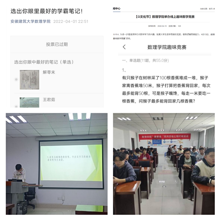 为促进广大学子端正学习态度,养成良好的学习习惯,营造浓厚的学习氛围,优化良好的育人环境,学院开展了一系列学风建设活动,“数学建模比赛”、“线上数学竞赛”、“考研送温暖”、“考研经验分享会”,力求以全方位、多层次的角度形成朋辈之间的良性互动,营造严谨、求优的学习氛围,从而激发和带动学院每位学生的主动学习意识,提升了学生的自主学习能力。