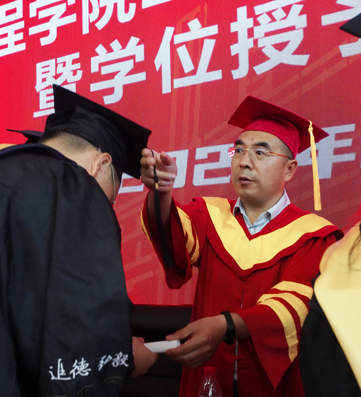 毕业生们依次上台,与会领导和教师代表为他们扶正流苏、授予学位。