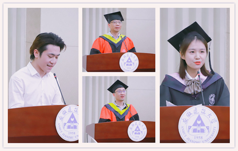 学院副院长在致辞中对全体毕业生表示衷心的祝贺,希望同学们以越挫越勇的意志面对人生的风雨;以知恩感恩的心态回报社会;以胸怀家国天下的格局,将人生理想融入为国家为人民的大事业中。教师代表马志句句情深、字字箴言,饱含祝福与期望,深藏情怀与勉励,希望同学们将青春投入时代使命,以热血报效家国情怀。2019级穆秋雨同学作为非毕业班代表致欢送辞,他分享了自己看到学长学姐们为考研考公早出晚归、风雨无阻的奋斗模样,并表示他们将以学长学姐为榜样,脚踏实地,行稳致远。2018级武芮同同学作为毕业班代表致答谢辞,武芮同回顾了在建大四年的青葱岁月,表达了对母校和老师的精心栽培和悉心教导的感激,并倡议全体毕业生追求卓越,行之有恒,成为勇于肩负历史使命的一代年轻人,共创个人与国家的美好未来!