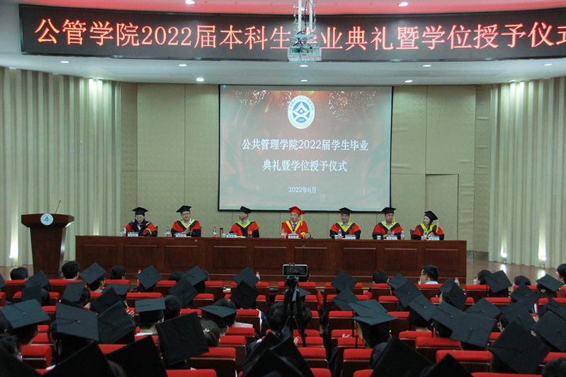 本网讯 茵茵夏日,莘莘学子,骊歌声起,扬帆远航。6月9日下午,公共管理学院2022届毕业生毕业典礼暨学位授予仪式在北校区图书馆二楼报告厅举行。校党委书记孙道胜出席典礼,公管学院党政班子成员、全体教师、辅导员、2022届毕业生260多人参加典礼。毕业典礼活动现场采用“线上+线下”相结合的形式,在腾讯会议平台同步直播,家长们可全程观看,共同见证开启人生新征程的难忘时刻。