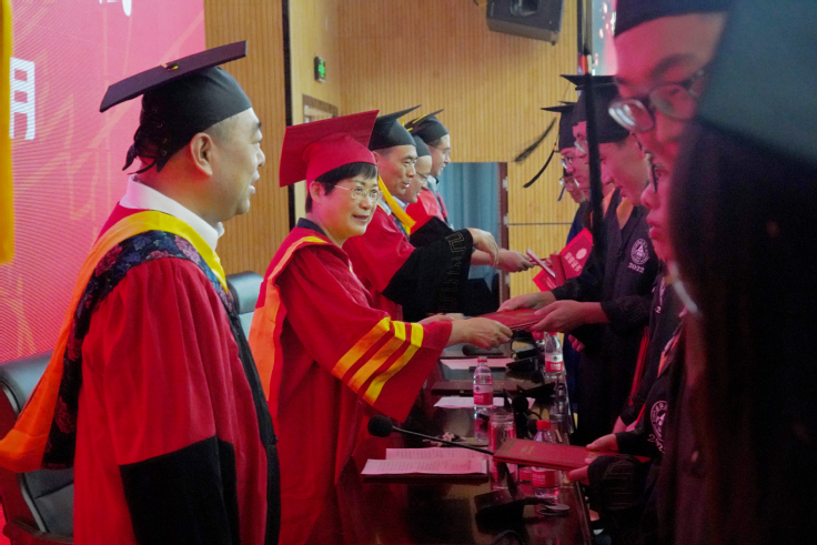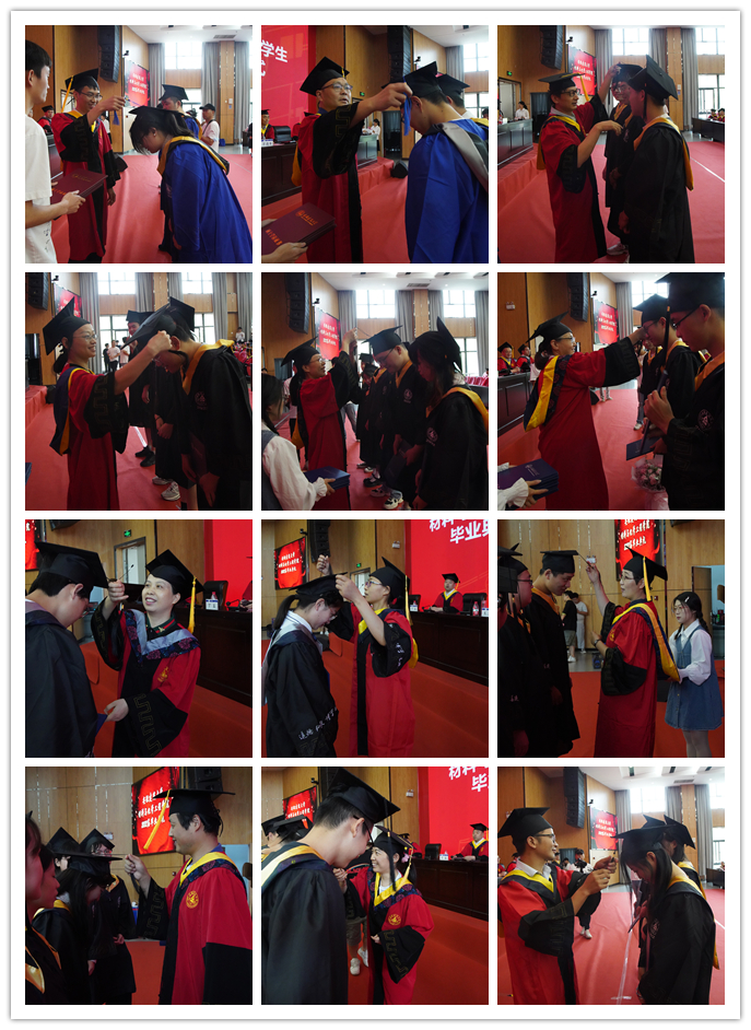 学院副院长分别宣读了授予学士学位、硕士学位毕业生名单。在欢快的音乐声中,与会领导亲切地为省、校级优秀毕业生正冠拨苏、授予学位。之后,五十余位毕业生学业导师依序上场,为自己所带学生一一扶正流苏,并合影留念。