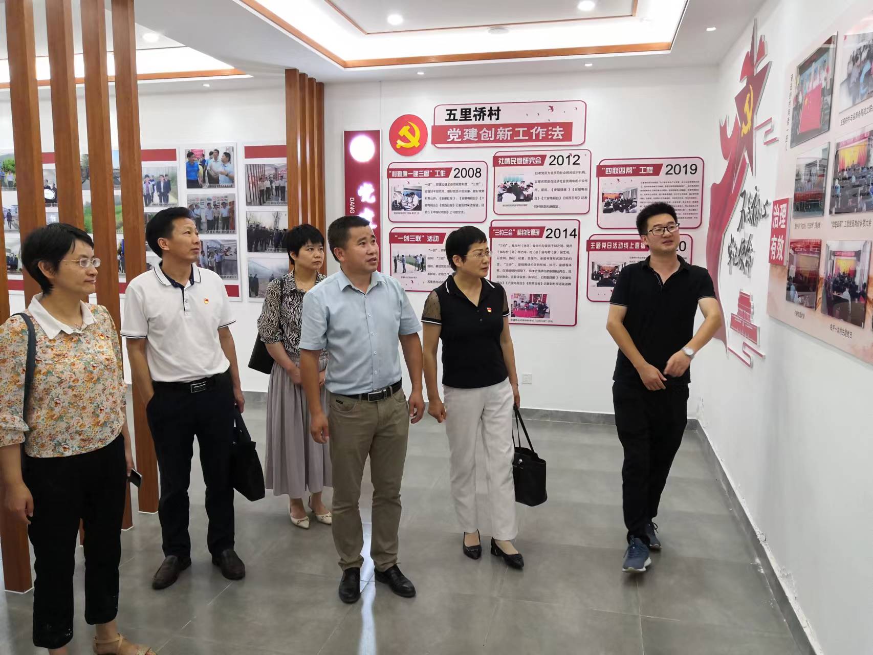 汇报结束后,支部全体党员在五里桥村支部书记方根生带领下参观了村史馆,方根生向大家介绍了村史村情、乡风民俗、村规民约等,包括家规家训、莘莘学子、寿星榜、乡贤榜、村庄规划图以及袁隆平院士开展水稻高产攻关试验点时的图片资料等,充分展现了新农村新风貌。