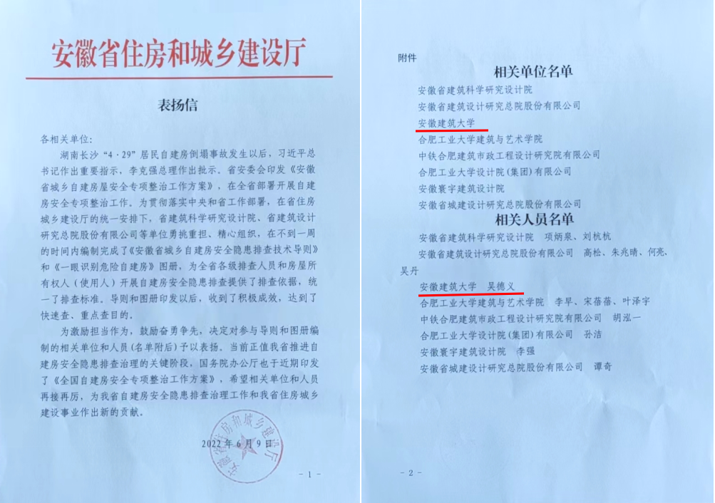 本网讯 为有效杜绝湖南长沙“4·29”等类似居民自建房倒塌事故,传达贯彻习近平总书记重要指示精神和李克强总理批示精神,执行省安委会印发《安徽省城乡自建房屋安全专项整治工作方案》,在全省部署开展自建房安全专项整治工作。近日,安徽省住房和城乡建设厅寄来表扬信,对ku游官方作为主编单位、ku游官方土木工程学院吴德义教授作为主编人员进行了表扬。
