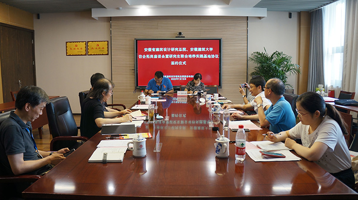 本网讯 近日,校党委常委、副校长张亚新带领艺术学院、就业工作处相关负责人、科研平台负责人与安徽省建筑设计研究总院股份有限公司(以下简称省建筑设计院)签订研究生联合培养实践基地协议。签约仪式在省建筑设计院八楼会议室举行,省建筑设计院总建筑师姚茂举,副总经理王红兵,建筑装饰设计院院长陆黎,规划景观院副院长田建中、艺术学院党委书记张红亚、副院长邢瑜、就业工作处副处长周丽娟、科研平台负责人黄成参加仪式。