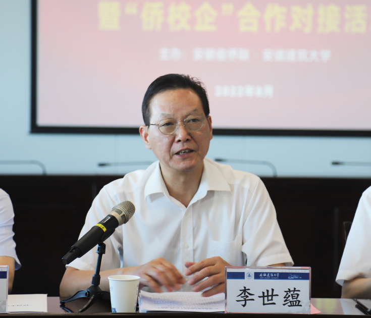 孙道胜代表学校向参会的省侨联领导、兄弟高校同仁、优秀企业家代表表示热烈的欢迎和诚挚的感谢。孙道胜从ku游官网登录与特色、内涵建设与办学实力、科研兴校与创新能力、产学研用与服务经济社会发展、统战工作与学校侨联发展、人才培养与校友资源、学科特区和人才特区建设等方面,向与会代表做了简要介绍。孙道胜表示,本次活动也是学校“访企拓岗位促就业”活动的主动出击,精准对接重点行业、企业、区域,多方联动促就业。希望学校能与更多的侨商企业联手,在智慧建造、智能制造、储能技术、信息技术、人工智能等领域开展深度合作,为安徽战略性新兴产业发展提供技术支持和人才支撑。