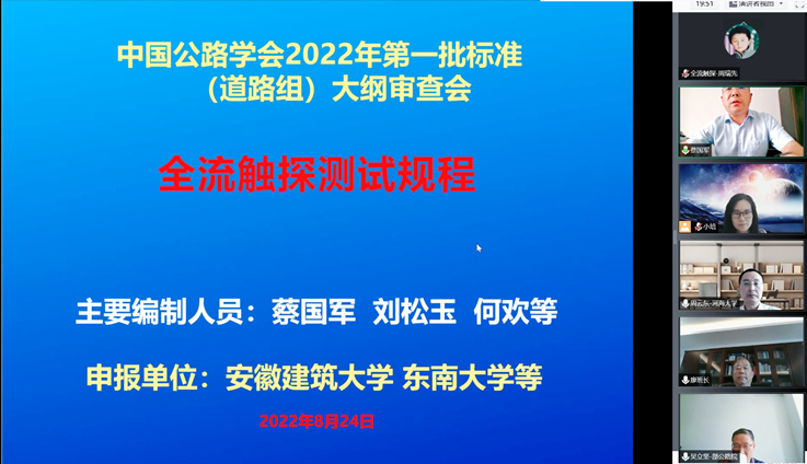 本网讯 8月24日,中国公路学会标准大纲审查会在线上召开,由我校蔡国军教授主编,东南大学、中交第四航务工程勘察设计院等13家单位30余人参编的《全流触探仪测试规程》大纲(下简称“大纲”)经过主编汇报,专家质询等环节,顺利通过专家评审。会议由中国公路学会标准委员会主持,校党委常委、副校长蔡国军教授以及各参编单位代表参加。