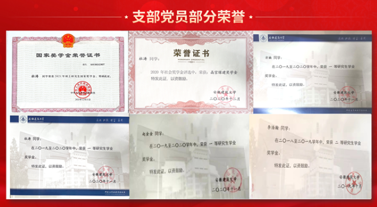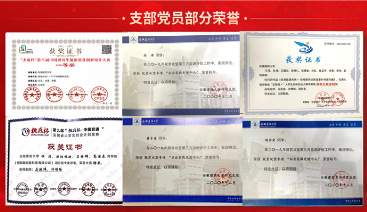 勇于比学争优,模范带头作用突出。近两年,党支部共有2名党员获得校“优秀共产党员”荣誉称号,2名党员以优异的成绩被合肥工业大学、河海大学录取为博士研究生,3名党员获得国家奖学金,8名党员获得一等研究生学业奖学金;党员发表高质量科研论文十余篇,获授权发明专利4项、实用新型专利3项、计算机软件著作权6项;参加国家级比赛1项,省级比赛3项,校级比赛7项,其中方浩同志的作品“智能光伏+—PV/T热电联供系统”荣获第八届中国研究生能源装备创新设计大赛全国一奖,刷新了自赛事举办以来安徽高校最好成绩。同时,支部党员下沉乡镇参加扶贫助困、防疫攻坚、学雷锋志愿等活动,为抗击疫情捐款1398元,3名党员获得校“脱贫攻坚专项社会实践先进个人”荣誉称号,2名党员以抗疫志愿者的身份参与到抗疫一线当中,安徽日报2020年4月1日专题报道了杜涛同志闻令而动、不怕牺牲、冲锋陷阵、积极抗疫的先进事迹。