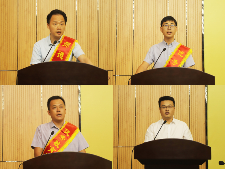 电信学院葛先玉、公管学院陈松林、材化学院刘开伟、保卫处王凯老师分别代表新进教师、师德标兵、优秀教师和优秀教育工作者发言。