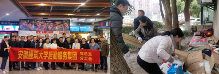 汛期来临前,党支部一线服务人员及时清理地面窨井盖积水漂浮物,党员干部身先士卒,趟着齐胸深的水,与物业公司人员对家属区挨家挨户摸排,帮助困难老人及时撤离,确保所有一楼的住户安全撤离;党员们在洪水过后,立即对残留淤泥、垃圾等进行清理冲洗、消毒,对图书馆内的徽派馆和书库等重要场所进行抢救性排涝,确保校园整洁有序。
