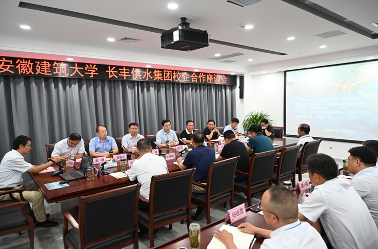 随后,双方围绕校企合作进行了交流座谈,座谈会由卫涌波副县长主持,卫涌波首先代表长丰县委县政府对黄显怀一行的到来表示热烈欢迎。程军介绍了长丰供水集团概况以及人员、机构等基本情况,并提出校企合作意向。蒋继国副主席回顾了长丰饮用水厂30年来的发展历程和运行情况,并就长丰供水集团的未来发展方向和潜在风险等方面提出了意见和建议。