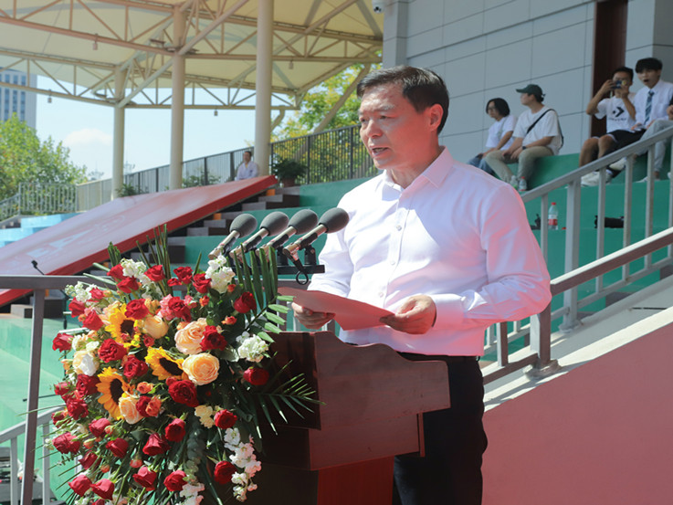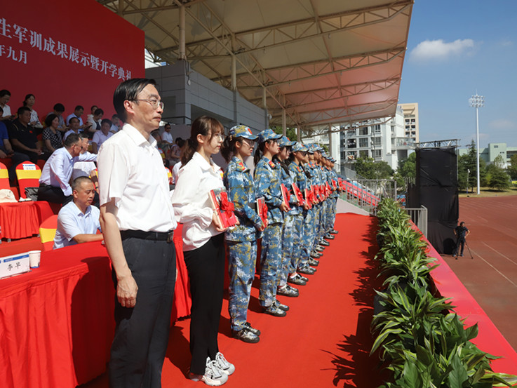 本网讯 朗朗金秋,朝阳初上,崭新的晨光,迎来了全新的开端。9月16日上午,学校2022级新生军训成果展示暨开学典礼在南校区田径场举行。校领导孙道胜、黄显怀、蔡新立、王玉兰、闵杰、蔡国军、李早及承训部队负责人出席典礼。学校职能部门主要负责人,各学院党委书记、院长、副书记、优秀校友代表、全体新生辅导员及2022级全体新生参加典礼。典礼由校党委常委、副校长蔡新立主持。