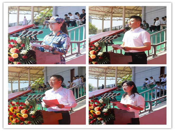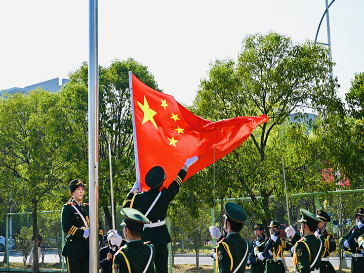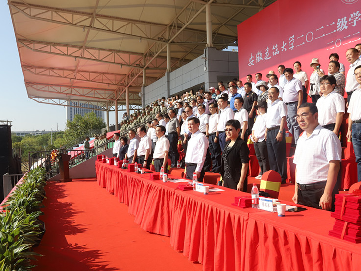 主席台上“进德 弘毅 博学 善建”的校训在明媚的阳光下分外醒目。典礼在庄严的国歌声中拉开序幕,鲜艳的五星红旗迎风招展,激昂的国歌响彻校园,将爱国心报国志深深烙印在建大学子心中。