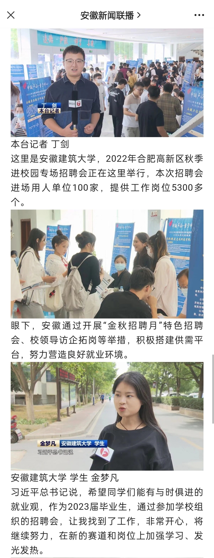 编者按:9月23日,2022年“中国声谷·量子中心”合肥高新区秋季校园双选会在南校区大学生活动中心举办。安徽电视台进行现场采访,并以《【喜迎二十大】勠力同心,用实干喜迎盛会》为题,在9月25日安徽新闻联播节目予以报道。