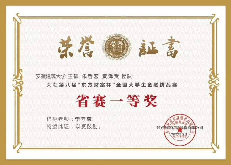 近日,第八届“东方财富杯”全国大学生金融挑战赛省赛落下帷幕。在经管学院李守荣博士精心指导下,经管学子朱哲宏、王硕、黄泽贤组成的团队经过三个月的激烈比拼,从全省六千多支代表队中脱颖而出,荣获省赛一等奖。