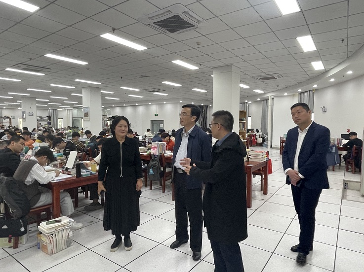 汇报会后,孙道胜带领与会人员深入图书馆各阅览室、自修室,与大学生读者深入交流,了解大学生读者使用图书馆的有关情况,聆听一线读者心声,叮嘱图书馆切实做好读者服务工作。