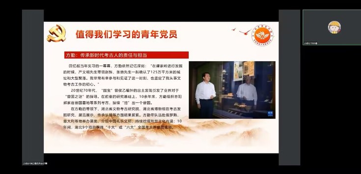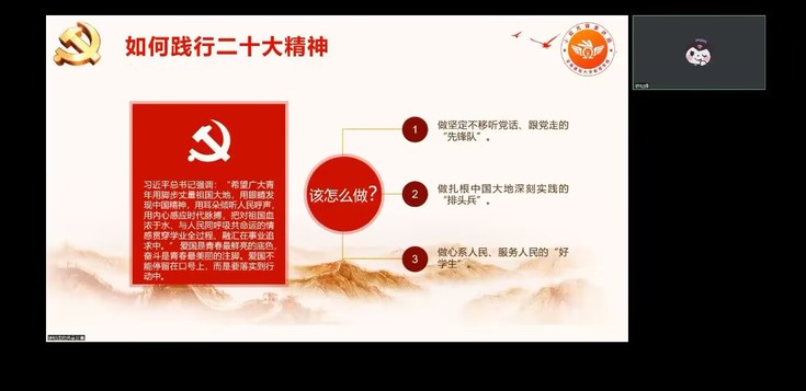 10月24日,数理学院“小欧”先锋宣讲团在线上开展“青春献礼二十大,奋进担当向未来”主题宣讲活动。先锋宣讲团成员徐明雅、羿宇航、何静、王欣芮、徐明雅分别向同学们讲述一大到二十大以来优秀党员的榜样模范事迹,号召同学们向这些优秀党员学习,最后宣讲团成员与同学们就青年学子该如何做才能真正践行党的二十大精神展开讨论。
