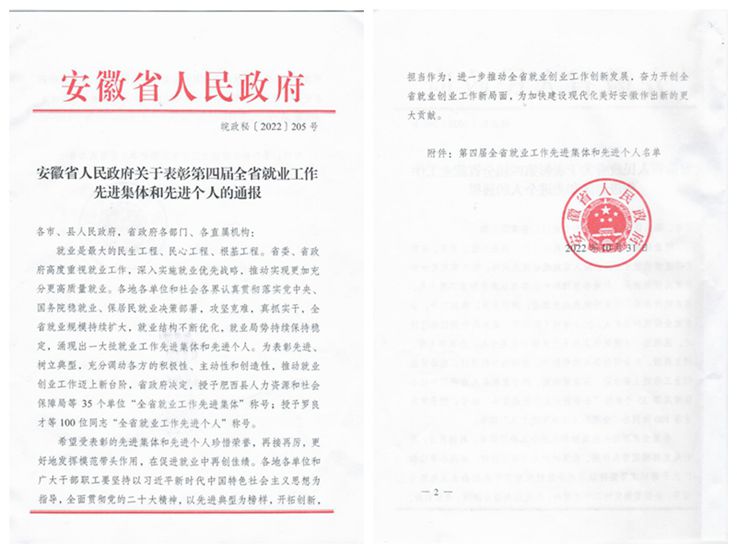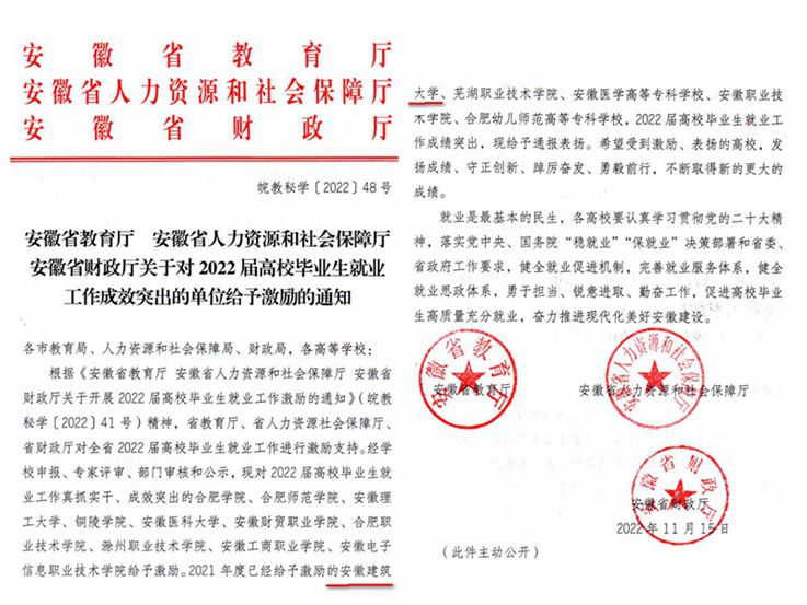 学校就业工作成效突出。2021届毕业生就业工作,被安徽省教育厅、安徽省人力资源和社会保障厅、安徽省财政厅联合激励表彰;11月15日,学校2022届毕业生就业工作再次获得上述三部门通报表扬,也是唯一一所连续两年获得表彰的省属本科院校。