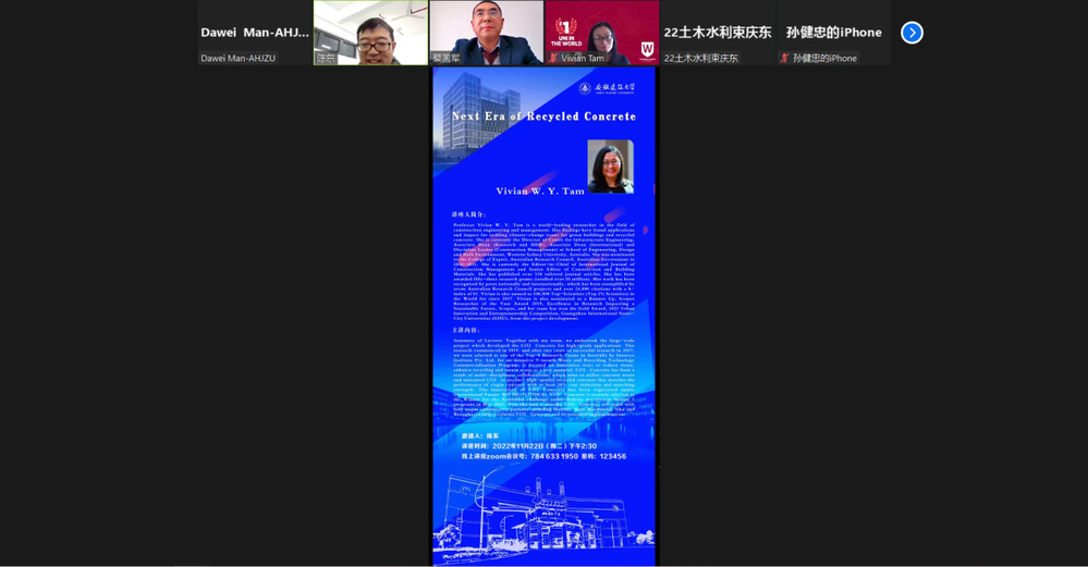 本网讯 11月22日下午,澳大利亚西悉尼大学Vivian W.Y.Tam教授应邀为土木学院师生作题为“Next Era of Recycled Concrete”的线上学术报告,本次报告会由ku游官方土木学院主办。校党委常委、副校长蔡国军为报告会致辞,会议由土木学院副院长陈东主持,土木学院教师和研究生参加了报告会。
