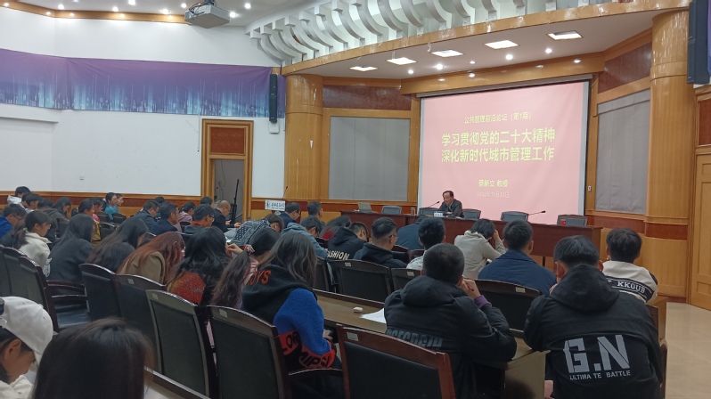 本网讯 为引导广大青年学生深入学习贯彻党的二十大精神,鼓励广大师生在新时代城市管理工作中建功立业,11月23日,公管学院在北校区F楼3楼报告厅举办公共管理前沿论坛第1期暨党的二十大精神解读报告会。报告会邀请校党委常委、副校长蔡新立教授主讲“学习贯彻党的二十大精神,深化新时代城市管理工作”的学术报告。公管学院院长黄佳豪主持,学院党政领导班子、相关专业系教师及城市管理等专业同学共160余人参加活动。