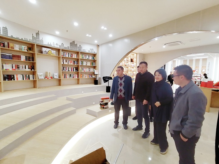 合肥市新华书店项目负责人详细介绍了校园书店的藏书、展品及后期运营方案。蔡国军及各部门负责人考察了校园书店的建设情况,对项目的运营细节、宣传和安全管理等问题进行了深入沟通,并提出了宝贵的意见和建议。