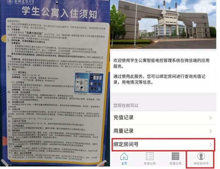 为方便学生自主查询宿舍电费及电量使用情况,2022年集团更换了南校区1-14#(9、10#除外)学生公寓电控系统模块,实现了南北校区所有宿舍学生用电查询功能,可查看宿舍当前的用电状态(用电正常、欠费、负载关断等),也可按需查询该宿舍照明或空调用电的充值记录明细(购电时间及金额、剩余电量)、用电记录(每日用电度数)。