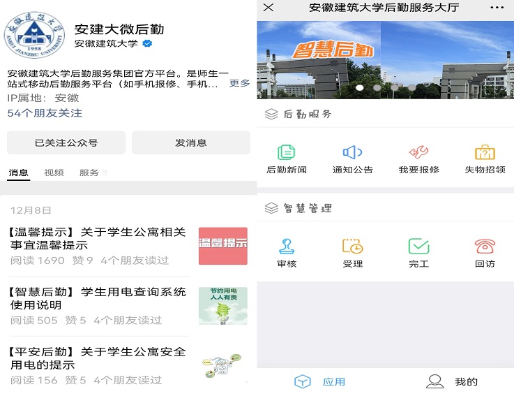 “安建大微后勤”公众号。“安建大微后勤”是为方便师生办事推出的一站式移动后勤服务平台,师生可以通过该智慧平台进行报修、反映问题,也可以实现一卡通充值以及学生公寓电费的查缴,同时,公众号会及时发布一些失物招领、公寓服务、温馨提示以及后勤最新资讯、通知、公告等内容,为师生解决问题提供便利及信息服务。2022年,全年通过“安建大微后勤”平台共收到报修消息14127单,并逐一及时解决,全力推动后勤服务工作落地落实。