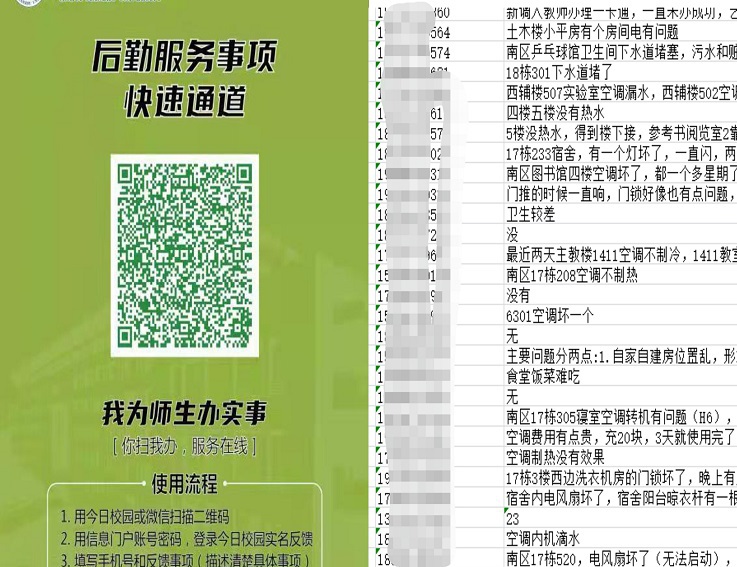 “你扫我办,服务在线”。“你扫我办”是为建立健全为师生办实事的长效机制,全心全意为师生群众做好服务保障、解难题、办实事,创建的一条“后勤服务事项快速通道”,师生可通过该渠道实名对后勤工作提出意见及建议。2022年,全年通过“你扫我办”平台共收集到1099份问卷,集团根据师生心声,主动查摆问题、对标发展需求,不断提升后勤保障服务水平。