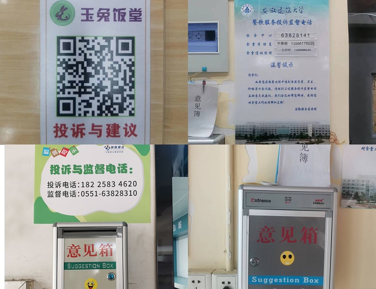 食堂桌面“二维码”、“公示栏”及“意见箱”等。秉持着“始于师生需求,止于师生满意,打造有温度的后勤服务”的工作理念,为在第一时间能够解决师生遇到的问题,学生食堂在餐桌上印有二维码,并在食堂大厅公示栏处张贴“餐饮服务投诉监督电话”,师生可以扫描二维码直接反映,也可以现场拨打食堂经理及工作人员电话。集团公寓、物业等部门设立“意见箱”、张贴“投诉监督电话”,多种方式便于师生反馈在学习生活中遇到的问题。