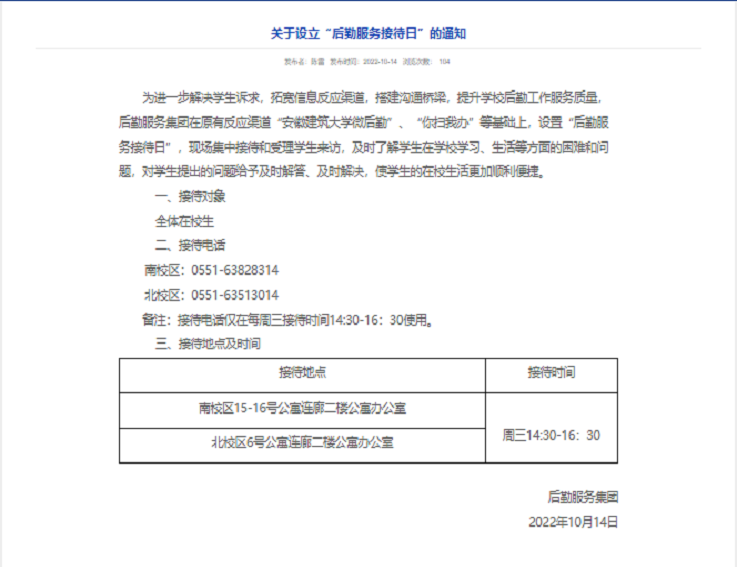 “后勤服务接待日”。为进一步解决学生诉求,拓宽信息反映渠道,搭建沟通桥梁,提升学校后勤工作服务质量,2022年10月14日,集团设置“后勤服务接待日”,现场集中接待和受理学生来访,及时了解学生在学校学习、生活等方面的困难和问题,对学生提出的问题给予及时解答、及时解决,使学生的在校生活更加顺利便捷。