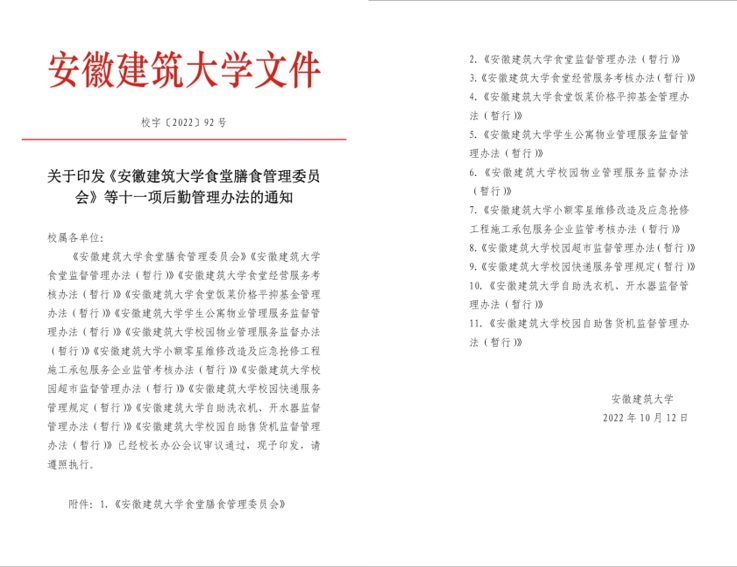 建章立制,科学管理,确保后勤管理服务工作规范有序开展。为有效提高后勤的规范化管理,2022年,在原有基础上,集团完善修订了《ku游官方食堂监督管理办法(暂行)》《ku游官方学生公寓物业管理服务监督管理办法(暂行)》《ku游官方校园物业管理服务监督办法(暂行)》《ku游官方校园超市监督管理办法(暂行)》《ku游官方小额零星维修改造及应急抢修工程施工承包服务企业监管考核办法(暂行)》等11项具有科学性、规范性和长效性的后勤服务保障工作制度。真正做到有章可循,有据可依,依规办事,也使今后的后勤保障工作更加程序化、规范化和制度化。
