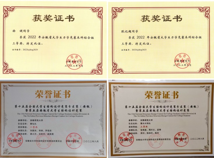 这一年,学院共组织1000多名同学参加创新创业类比赛,共获得省级以上奖项79项,各级各类大学生创新创业项目立项123项。其中,一类学科竞赛国家级铜奖1项,二类学科竞赛省级一等奖9项,二等奖6项,三等奖5项;三类学科竞赛省级一等奖7项,二等12项,三等奖27项。四类学科竞赛省级一等奖4项,二等奖1项,三等奖4项。积极参加安徽省结构大赛,获得一等奖1项、三等奖2项和最佳创意奖的好成绩。在第四届安徽省大学生桥梁设计大赛中荣获一等奖3项、二等奖1项、三等奖3项;道桥专业学子斩获2022“一带一路”国际大学生数字建筑设计竞赛一等奖;城市地下空间专业学子获第八届“建行杯”安徽省“互联网+”大学生创新创业大赛安徽省金奖;测绘专业学子在2022年全国大学生测绘学科创新创业智能大赛中取得3项特等奖。