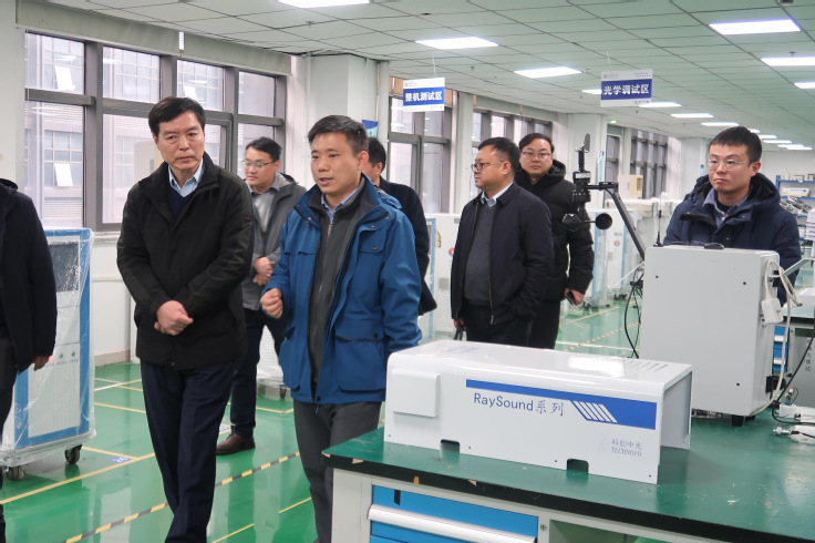 黄显怀一行参观了科创中光公司展厅和研发生产车间,曹开法详细介绍了公司的发展历程、业务布局、科研成果、人才团队和未来规划。