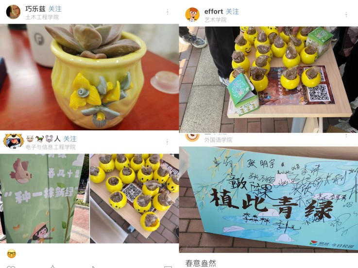 本次活动采取线上线下相结合的方式进行,校易班发展中心向同学们免费发放绿植,讲解种植方法,并邀请同学们拍照打卡后,在“易班·今日校园”平台“种一抹绿色”话题下发表自己对建设绿色中国的美好祝愿。在校师生积极参与此次活动,线下摆摊共发放绿植180余盆,线上话题共征集近200余篇作品,活动话题热度较高,受到学校师生的支持与喜爱。