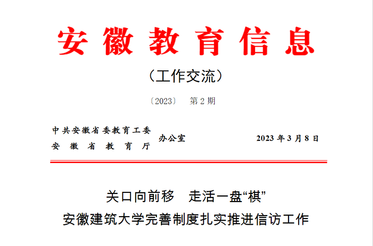 本网讯 近日,《安徽教育信息(工作交流)(〔2023〕第2期)》专题宣传了学校信访工作特色经验做法,充分肯定了学校信访各项工作。